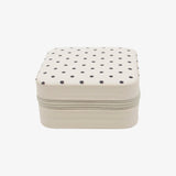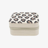Compact white jewelry travel case with playful printed lining — available in polka dots or cheetah print. Features divided compartments and hooks to keep rings, earrings, and necklaces organized on the go.